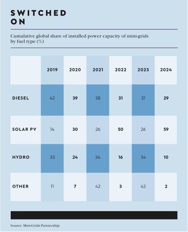 Bright idea Mini-grids are driving the continent’s push to connect 300 million people to electricity by 2030 African villages don’t get much more remote than in Madagascar and Mali. Isolated and off the grid, most settlements on Madagascar’s wild island and Mali’s dusty Saharan plains make do without electricity. nIn Madagascar, according to 2022 World Bank estimates, only 36% of the population has access to electricity; in Mali, that figure is officially 53%. The reality on the ground is that national power grids simply don’t reach Africa’s out-of-the-way places. It costs too much to set up and maintain power lines into the hinterland, and there’s so little economic activity out there that the return on investment is simply too low. At least, that’s what the narrative has been so far. Last year Welight announced that it was electrifying 186 small villages in Madagascar and Mali, connecting about 10 000 people a month to independent mini-grids. Mini-grids, or micro-grids, are small-scale electricity systems that supply power to a community, operating independently nfrom the national grid. They’re typically nused in rural areas, where the national ngrid can’t reach. This all feels a world away from Dar es Salaam, Tanzania’s sprawling, fast-growing megacity with its Chinese-funded bus rapid transit system and multiple megaprojects. But it was here, in Dar, that 30 African heads of state met in January for the Mission 300 Africa Energy Summit, where they committed to uniting governments, development banks, partners, philanthropies and the private sector to connect 300 million Africans to electricity by 2030. The Dar es Salaam Energy Declaration is ambitious: more than 600 million people in Africa live without electricity – and most of those are in the continent’s remotest parts. The Mission 300 partners pledged more than US$50 billion to support this goal, nwhile 12 countries – Chad, Côte d’Ivoire, nthe DRC, Liberia, Madagascar, Malawi, Mauritania, Niger, Nigeria, Senegal, Zambia and Tanzania – presented detailed national energy compacts that set country-specific targets to scale up electricity access, increase the use of renewable energy and attract additional private capital. These were backed by a string of funding commitments from the likes of the African Development Bank (AfDB) Group and the World Bank Group (US$48 billion), Opec Fund (US$1 billion), Agence Française de Développement (EUR1 billion), Asian Infrastructure Investment Bank (US$1 billion– US$1.5 billion) and Islamic Development nBank (US$2.65 billion). ‘Access to electricity is a fundamental human right. Without it, countries and people cannot thrive,’ Ajay Banga, president of the World Bank Group, said at the event. ‘Our mission to provide electricity to half of the 600 million people in Africa without access nis a critical first step. To succeed, we must embrace a simple truth: no one can do nit alone. Governments, businesses, philanthropies and development banks neach have a role – and only through collaboration can we achieve our goal.’ The good news is that many African countries are already on their way to ngreater electrification, with mini-grids powering the work. According to the nMini-Grids Partnership’s 2024 State of nthe Global Mini-Grids Market Report, the number of mini-grid installations around the world has grown six times since 2018, with much of that happening in sub-Saharan Africa. According to IEA data, about 21 500 mini-grids supply electricity to about 48 million people around the world; and nearly half the top 20 countries with extensive access to mini-grid electricity are in sub-Saharan Africa. What’s especially notable is the Mini-Grids Partnership’s finding that those new mini-grids are increasingly relying on clean energy. Between 2018 and 2024, the report found a significant decline (down from 42% to 29%) in the share of diesel capacity in mini-grids, accompanied by a sharp increase (14% to 59%) in the share of solar PV systems during the same period. The report attributes the growth to two key factors: increased funding from private investors, governments and development partners; and declining costs of mini-grid components. Maturing technology nis taking care of the second, while initiatives such as Mission 300 are taking care of the first. Even before the Mission 300 launch, remote areas across Africa were plugging into mini-grid power. In Sierra Leone last year, the national government adopted a Results Based Financing (RBF) mechanism for solar mini-grids, particularly in rural areas, with EUR20 million financing from the European Union. Meanwhile, two 26.88 kWp combined capacity mini-grids were commissioned in northern Liberia’s rural Gbarpolu County, with funding coming in part from the Swedish government’s Beyond the Grid Fund for Africa initiative. Up to 8 000 Liberians are expected to benefit. And so the list goes on. Ethiopia’s Ministry of Water and Energy recently announced that ‘preparations are in the final stages’ to provide solar-powered mini-grid electricity to at least 100 rural towns; while work has begun on 60 solar mini-grids in Zambia’s Eastern Province, under the country’s Access to Electricity and Renewable Energy Production programme. The value of micro-grids, which are increasingly being used to provide electricity to millions of people around the world, can be enhanced by the use of technology to track usage Speaking at the Mission 300 Africa Energy Summit in Dar es Salaam, Akinwumi Adesina, president of the AfDB Group, said: ‘Critical reforms will be needed to expand the share nof renewables, improve utility performance, ensure transparency in power purchase agreements and licensing, and establish predictable tariff regimes that reflect production costs. Our collective effort is to support you, heads of state and government, in developing and implementing clear, country-led national energy compacts to 