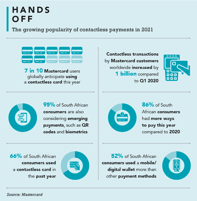 Cashing in Contactless payments have risen significantly during the course of COVID-19, dramatically changing the point-of-sale experience It had been coming since the start of the pandemic, and in May 2021 – just more than a year into South Africa’s national COVID-19 lockdown – the switch finally happened. After months of social distancing (no handshakes, no hugs), FNB confirmed that its customers’ contactless payments had surpassed chip and PIN contact payments for the first time. ‘This is a remarkable milestone for the financial services industry, and it augurs well for efforts to improve safety and convenience in the payments network,’ according to FNB payments executive Raj Makanjee. ‘We are delighted to see our customers pioneering what we believe to be the future of payments globally. It goes without saying that the pandemic has definitely accelerated the growth in contactless payments, as consumers and retailers continue to prioritise safety, convenience and efficiency.’ To be fair, ‘accelerated’ doesn’t do the trend justice. In March and April 2021 FNB’s card customers processed more than 30 million contactless payments (worth in excess of ZAR10 billion in each of those months), providing the tipping point to a 12-month growth path that saw the bank’s contactless payments recording anywhere between 200% and 400% year-on-year growth. Makanjee is right, of course. While customers were already adopting tap-to-pay technology before the pandemic, COVID-19 pushed it well and truly into the mainstream. In Visa’s 2020 Back to Business survey, nearly half of consumers (48%) said they would not shop at a store that only offers payment methods that require contact with a cashier or shared machine such as a card reader. In the 2021 report, Visa notes that more than half (56%) of consumers had used contactless payments whenever possible in the past three months, making it the biggest shift in terms of shopping habits. Aldo Laubscher, Visa South Africa country manager, believes this makes it critical for businesses to expand their acceptance methods beyond cash, and into contactless payment solutions such as Visa’s Tap to Phone mobile app, which launched in South Africa in May. ‘Tap to Phone is a quick, easy and secure way to pay that is perceptibly faster and more convenient than paying by cash,’ he says. ‘The experience is much swifter for consumers, especially as smartphones are quickly becoming commonplace. For merchants, tap-to-pay technology speeds up queueing times and reduces the burden of handling cash.’ Visa believes that, with billions of phones around the world at the ready, there’s an enormous opportunity that comes with – as the company puts it – ‘lighting them up as payment acceptance devices’. Contactless payments are the preferred choice in the formal retail sphere. Now tech providers are working on reaching informal traders Mastercard, with its Tap & Go solution, was already talking about all of this at the start of lockdown. ‘The act of buying everyday supplies such as eggs, toilet paper, medicine and other necessities has changed dramatically, with shoppers having to adjust to social distancing measures and other new challenges,’ Mark Elliott, division president of Mastercard, Southern Africa, said in April 2020. ‘According to a new Mastercard study, this shift in behaviour is particularly clear at checkout as people express a desire for contactless and voice concerns over cleanliness and safety at the point of sale.’ Back then, 69% of South African respondents to a Mastercard survey said contactless was their preferred payment method, with 71% adding that they preferred shopping at merchants that accepted contactless payments. In September 2021, as if to confirm the shift, Hellopay’s SoftPOS won the Most Innovative Solution prize at the MTN Business App of the Year Awards. SoftPOS, a partnership with Mastercard, is a contactless acceptance solution that turns any Android device enabled with near-field communication (NFC) into a physical point of sale. A free app, it’s well suited for low-value transactions. That’s good news for spaza-shop owners, market-stall traders and mobile servicemen, whose adoption of the technology is driving the contactless payment revolution. ‘Eliminating the need for a dedicated terminal and enabling the merchant to use their cellphone to accept card payments is revolutionary and a significant game-changer within the SMME sector,’ says Zunaid Miya, MD of Hello Group’s financial services business. ‘Lowering the barrier to entry for merchants to accept card payments is sure to result in a significant increase in the number of transactions settled via card.’ Andrew Dawson, MD of mobile payment software company MACmobile, agrees. He believes that while touchless payment has now become standard in the formal retail space, the next step would be to ‘conquer the informal sector’ where, he says, ‘cash is king’. Dawson outlines how technology providers are already providing the ‘push’ through services such as MTN’s Mobile Money or Telkom’s Yep. What’s needed next is the ‘pull’ in demand from the informal trading sector. ‘This boils down to education,’ he says. ‘We need to now educate, empower and create an environment where it’s not too costly to digitalise cash. ‘Historically, the infrastructure, software and support systems required from a banking perspective were expensive and there was little or no uptake as a result. Now, thanks to innovation from the banking and fintech sectors, there is a strong educational drive that will help make the change to move society to more of a cashless, digital environment.’ For this to succeed, he adds, it will be necessary to show retailers and the communities that support them the upside of being digitalised. ‘Without this buy-in at consumer level, including those grant recipients with their preference for cas