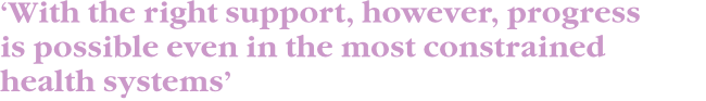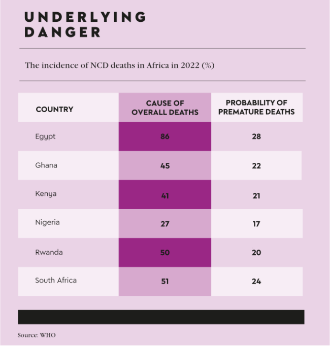Back to basics Africa’s healthcare services are finding simple solutions to address a rise in non-communicable diseases Infectious diseases exact a high toll on sub-Saharan Africa. COVID aside – which has caused an estimated 173 988 deaths in Africa to date – TB, malaria and HIV continue to drive mortality rates. In 2021, Africa accounted for 23% of new TB cases worldwide; 95% of malaria cases and 96% of malaria deaths (with children under five accounting for about 80% of all malaria deaths); and by far the highest share of global total new HIV infections (860 000), with about 66% of the total number of people living with HIV located in sub-Saharan Africa. As the COVID pandemic recedes, TB is once again the deadliest disease in Africa. Malaria cases appear to have stabilised, and while HIV infection rates continue to decline in some regions, Africa is still the epicentre for global infections. Yet these diseases, whose prevalence is inextricably linked to poor socio-economic conditions, are set to be eclipsed by an entirely different category of illness. The WHO reports that non-communicable diseases (NCDs) are about to become the leading causes of death in sub-Saharan Africa by 2030 – exerting additional pressure on the region’s already-strained treatment and care services. NCDs – also known as chronic diseases – refer to diseases that are not transmissible and are typically caused through behavioural, environmental and/or congenital conditions. Cardiovascular disease, cancer, hypertension, diabetes, sickle cell and Alzheimer’s disease are all examples of NCDs. NCDs were responsible for 37% of deaths in Africa in 2019, rising from 24% in 2000, ‘largely due to weaknesses in the implementation of critical control measures including prevention, diagnosis and care’, according to the WHO. Matshidiso Moeti, WHO regional director for Africa, has voiced concern that premature deaths from NCDs are rising among people younger than 70 years – intimating that external conditions, rather than old age, are the cause. So what’s driving this alarming rise? Well, the COVID-19 pandemic didn’t help, says the WHO. ‘About 80% of countries in Africa reported disruption to at least one health service against non-communicable disease between May and September 2021. Countries are striving to restore services, although many have not yet been fully re-established.’ The causes of NCDs in Africa may overlap with, but are unlikely to mirror, those of developed nations. Seventy-seven percent of all NCD deaths are in low- and middle-income countries, suggesting poor socio-economic conditions play a role, such as malnutrition, poor oral health and poor air quality; whereas NCD risk factors particular to developed nations are more likely to be associated with affluence or urbanisation, such as greater consumption of saturated fats, cholesterol and dietary calories. Consumption of cigarettes, alcohol, poor nutrition and decreased physical activity are risk factors common to most populations. In many parts of the continent, access to health services is limited, which hinders the prevention, early detection and treatment of NCDs ‘The Lancet Commission on Reframing Non-communicable Diseases and Injuries for the Poorest Billion showed that NCDs are a major endemic cause of suffering and death for rural populations in Africa,’ says Gene Bukhman, co-chair of the NCDI Poverty Network steering committee and associate professor at Harvard Medical School. ‘These NCDs include an extremely diverse set of conditions ranging from Type 1 diabetes, rheumatic heart disease, and sickle cell disease to childhood cancer, and severe mental illness. This is due to the persistence of risk factors directly related to poverty such as […] lack of access to healthcare.’ Anne Kamau, deputy director of the African Research Universities Alliance Centre of Excellence for NCDs at the University of Nairobi, Kenya, elaborates. ‘NCDs are broad and cut across individuals’ lifespan. They vary according to demographic factors – age, gender, social class, social-economic status; geographical factors – rural and urban; within urban settings – low-income, middle-income, and upper-income areas. They are also linked to environmental factors, for instance expo-sure to air pollution, social and cultural environments that individuals live in, and several other factors. ‘Wealth and poverty, as well as urbanisation all contribute to the rising NCDs problem [in Africa]. While the rising middle class has higher obesity levels, partly due to sedentary lifestyle, this is also a result of ineffective planning to address the lifestyle needs of individuals,’ says Kamau. ‘In countries with better health outcomes, walking and cycling are prioritised, as well as use of travel modes that integrate walking. Hence, urbanisation is not the problem, but how well urban systems are designed to respond to the health needs of citizens, and through provision of enabling infrastructure. ‘With the right infrastructure and public engagement/education, individuals have the capacity to adopt healthier lifestyles. With poverty, this becomes a problem especially with regard to access to health services that would promote early detection and prevention of NCDs,’ she says. ‘The state of health services in most sub-Saharan African countries is such that individuals seek care mostly when sick, and for the poor, this is likely when NCDs like cancer, hypertension and related health challenges are at an advanced stage. The challenge therefore is not just poverty, but lack of inclusive healthcare systems. Individuals most affected by poverty live in rural areas and in the urban informal settlements.’ The urgency of taking action is not lost on authorities. In April 2022, a landmark meeting in Ghana saw heads of state and health leaders sitting down to find ways of accelerating progress against NCDs, emphasising the double burden of both in