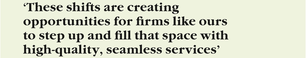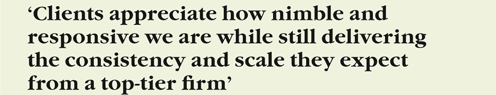 ‘Finally, we’re actively engaging with regulators and standard-setters to influence the future of governance and sustainability. Environmental, social, governance [ESG] services like risk assessments and carbon footprint reporting are becoming integral to business performance. This circles back to our brand promise – we are nimble, everywhere our clients need us to be, experienced across industries and trusted to deliver.’