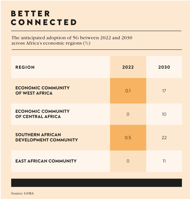 In the fast lane The features of 5G technology offer massive connectivity opportunities for corporates A 10 to 100x increase in data rate; 10x decreased latency; a 10 to 100x increase in number of connected devices; a 1 000x increase in mobile data volumes; 3x greater spectrum efficiency; and a 10x reduction in power consumption. That, in the words of the GSMA, is what 5G will offer over the capabilities of 4G. ‘These improvements are enabled by 5G’s more advanced core network technology, along with the use of more efficient radio technologies, more spectrum bandwidth and more densely built networks. However, while 5G offers superior performance over 4G, both network generations will coexist comfortably into the 2030s. Considering the time required to extend 5G coverage into less densely populated areas, users will continue to rely on 4G networks for 5G non-spots for the foreseeable future,’ says the organisation in its 5G in Africa: Realising the Potential report. 5G technology, the fifth generation of mobile networks, has ignited a transformative wave across the globe. Its lightning-fast speeds, low latency and massive connectivity potential are compelling features. One of the critical facets of 5G is its ability to facilitate IoT. IoT devices offer enhanced automation and efficiency across industries such as education, healthcare, logistics, manufacturing, mining and agriculture, allowing them to be much more efficient. The MTN Group, Africa’s largest mobile provider in terms of subscriber numbers, has announced the formatting of 5G networks in several countries, including South Africa, Nigeria, Côte D’Ivoire, Ghana and Uganda. It is ramping up its roll-out of 5G sites, ‘targeting a population coverage of 10% to 30% in the medium term’, according to a company statement. In its year-end report for 2022, MTN Group CEO Ralph Mupita says the company had rolled out about 2 500 5G sites across the markets in which it operates. ‘In the period, we rolled out 3 498 3G and 7 993 4G sites, culminating in our 3G and 4G coverage increasing by 9 million and 45 million people, respectively,’ says Mupita. ‘In 2022, we rolled out 1 570 5G sites, mainly in South Africa and Nigeria, bringing our total number of 5G sites to 2 527.’ In South Africa, MTN is rolling out 5G after winning spectrum in the auction held by the Independent Communications Authority of South Africa (ICASA). Additional spectrum is expected to be released in the short term. After winning 100 MHz spectrum for 5G in the auction, MTN became the first operator to launch 5G in Nigeria in 2022. ‘We are targeting 10% 5G population coverage by end-2023. The other spectrum winner is yet to launch its network,’ he says. Rival Vodacom, meanwhile, in March 2022, ‘acquired a total of 110 MHz high-demand spectrum as part of the ICASA auction and assignment process’, it notes in a press release. In the Western Cape alone, it adds, it has quadrupled its 5G network reach over the last year, with 200 base stations now offering 5G. Vodacom plans to invest ZAR570 million during the course of ‘this financial year into the region’s network as part of the company’s commitment to building an inclusive digital society. Of this investment, ZAR470 million is allocated to improve the quality, capacity and reach of the broadband network infrastructure in urban and rural areas. This network investment will continue to focus on further expansion of the 5G footprint, ongoing modernisation of the existing network infrastructure, and upgrading of base station sites with more LTE capacity throughout the province. This will provide an improved data experience for our consumers and ideal connectivity for businesses with growing digital needs’. In October last year, Safaricom launched the first of 35 5G sites in Kenya, and by July this year it had a total of 205. That month it announced it would add another nearly 600 by March 2024. Its domestic rival, Airtel, launched its 5G services across the country in the middle of this year. ‘We view 5G as being critical in delivering new solutions that will address economic development, healthcare, manufacturing, infrastructure and even delivery of government services,’ said Safaricom CEO Peter Ndegwa at the launch ceremony last year. Globally, 5G tech is being lauded for its fast data transfer rates, minimal latency and vast potential for interconnection Despite the huge benefits of 5G though, it remains to be seen how the technology will be completely rolled out in Africa, particularly outside major urban areas. ‘The 5G roll-out in Africa will take a different format to what we’ve seen in many of the pioneer markets,’ according to Kenechi Okeleke, director of social and regional research at GSMA Intelligence, in an interview with African Business. ‘The 5G roll-out in Africa will most likely take a phased approach, whereby operators roll out 5G based on the need and demand for it. ‘As an operator, you may be able to deploy 5G, but you also have to think about the ability of users in that location to get their hands on a 5G device. There is no point building a 5G network where people are not able to afford the devices they need to access that network.’ This was a point emphasised by Ndegwa at the Safaricom 5G launch in October 2022 when he said there were around just 200 000 5G-compatible smartphones in the country out of nearly 27 million such devices. ‘Until 5G device prices begin to come down, it’s hard to see adoption levels rising faster than what we have currently projected,’ says Okeleke. Apart from affordability, many experts believe that the initial drivers of more widespread 5G adoption will be large corporates, particularly those that can take advantage of the data processing benefits of 5G. An illustrative example of this is the Phalanndwa colliery in South Africa’s Mpumalanga province, operated by Canyon Coal. MTN, Huawei and Minetec Smart Mining began col