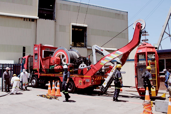 Swift passage Deep-level mining has become safer with the successful testing of a locally developed mobile mine rescue winder (MMRW) at a shaft in South Africa. The operation – led by Mines Rescue Service (MRS) in conjunction with members of Minerals Council South Africa, and the departments of Mineral Resources and Energy and Labour – was carried out at Gold Fields’ South Deep Twin Shaft complex, which at 3 km is the world’s deepest single-drop shaft. According to Engineering News, the development is significant in that previously winders could reach a depth of only 1.2 km. The testing involved lowering and raising a lift unguided at a speed of 1.5m per second, with a simulated load of six people, to a maximum depth of 3 km. MRS CEO Mannas Fourie says that once the MMRW has been fully licensed by the department, ‘we will be able to access employees located at depths of up to 3 000m faster than we were able to before in the event of an emergency’. The MMRW was designed and manufactured for MRS by the Tech Edge Group’s Winches and Winders. According to Winches and Winders chairman Russell Moore, the ‘go-anywhere, self-contained rescue winder is specifically designed to address the need for rapid response, deployment and resolution of underground mining emergencies’. 9 February 2021 Image: Mines Rescue Service