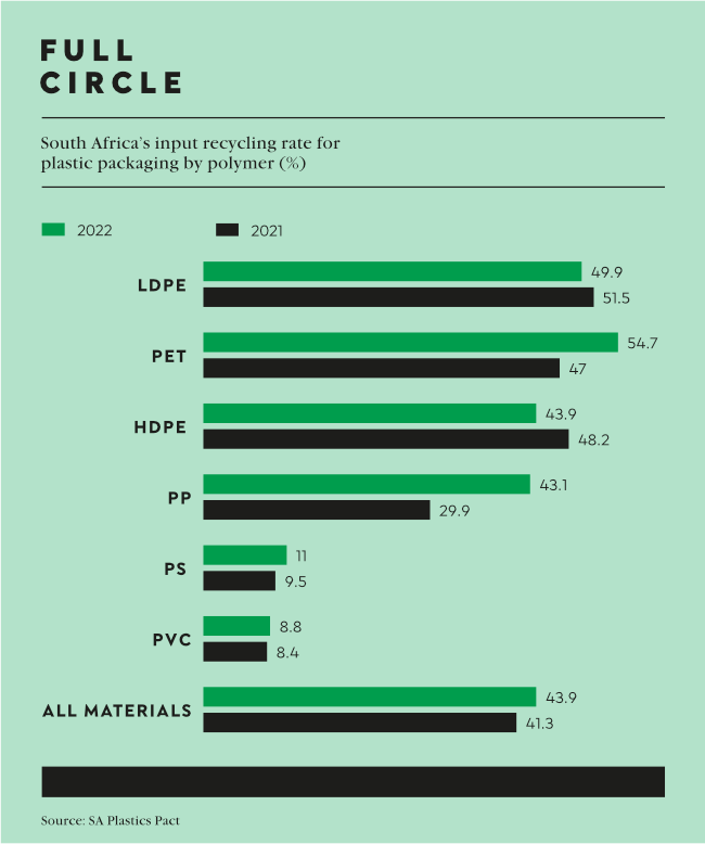 Material worth While plastics recycling in South Africa is commendable, more can still be done to reduce waste to landfill South Africa is grappling with a modern-day challenge that threatens its environmental well-being – plastic pollution. As the scourge of plastic waste continues to impact on ecosystems and communities, the state of the country’s plastic recycling industry – albeit higher than the global average – has become a focal point for sustainable development. The SA Plastics Pact, established in 2020, endeavours to hold its members – comprising South African businesses and organisations – accountable to specific circularity targets set for 2025. These targets include a reduction in unnecessary or problematic plastic packaging, ensuring that 100% of plastic packaging is reusable, recyclable or compostable; achieving a recycling rate of at least 70% for all plastic; and incorporating an average of 30% recycled plastic across all packaging materials. The SA Plastics Pact says South Africa is among the best globally in terms of mechanical plastics recycling. ‘First World countries with sophisticated collection systems are not achieving anything near what South Africa has achieved, especially with regard to thin polyethylene films and contaminated post-consumer plastics. Across South Africa, popular materials are collected and recycled into new raw material. However, lots of waste, including recyclable plastics waste, is still ending up in landfill and in the environment.’ Indeed, South Africa’s landfill sites are still stretched to capacity, with the waste-management industry warning that country is dangerously close to ‘day zero’, while ‘the impact of the pandemic saw a significant rise in the utilisation of single-use plastics, as well as a decline in collection and recycling rates, and has created a massive increase in the use and disposal of PPE waste’, says Kate Stubbs, marketing director at waste-management company Interwaste. ‘All of which is contributing to a mounting problem.’ South Africa has made commendable strides in recent years to address the plastic pollution crisis. Initiatives include the extended producer responsibility (EPR) programme – implemented in November 2021 by the Department of Forestry, Fisheries and the Environment – which makes manufacturers responsible for the entire life cycle of their products. As Cheri Scholtz, CEO of producer responsibility organisation (PRO) PETCO, explains in JSE Quarterly, this means that producers must assume responsibility for their products up to, and including, the end-of-life stage of their product cycle. ‘The producer for packaging is either the brand owner of the products using the packaging; the retailer – in the case of house brands; or the importer of goods contained in packaging,’ she says, adding that South Africa’s legislation ‘moved from voluntary to mandatory EPR amid increasing consumer and governmental pressure on brands to ensure end-of-life solutions for their products beyond consumer use’. Formerly a voluntary initiative, EPR was managed by different PROs. Although the fundamental nature of oversight remains intact, a significant shift has occurred. Now, every company or brand engaged in the production or importation of any type of plastic packaging for distribution is mandated to remit an EPR fee per ton. Additionally, strict government-defined targets for annual collection and recycling have been instituted, compelling compliance from businesses over the upcoming five years. In another noteworthy move for environmental stewardship, Plastics SA announced in April last year that the Association of Rotational Moulders of Southern Africa, the Expanded Polystyrene Association of Southern Africa, and Kainotomia Polymers had pledged their commitment to Operation Clean Sweep – spearheaded by leaders in the plastics industry and which seeks to combat plastic pollution in oceans and rivers. July saw the SA Plastics Pact expanding its alliance, with Food Lover’s Market, Naspers, Sir Fruit, the Consumer Goods Council of South Africa (CGCSA), and the City of Johannesburg joining as signatories. Food Lover’s Market stands alongside other retail giants such as Pick n Pay, Woolworths, Spar and Clicks, while Naspers aligns with Media24 and Takealot, which are also active signatories. With a robust membership of more than 9 000 companies, the CGCSA, as a representative body, holds considerable sway in influencing circularity for plastic packaging in South Africa. This collaborative effort between industry leaders, businesses and organisations underscores a collective commitment to responsible plastic use and environmental sustainability. As these initiatives gain traction, they represent significant strides toward creating a more circular and eco-conscious approach to plastic packaging in South Africa. However, one of the key challenges that remains is insufficient collection and sorting infrastructure. While urban areas often have relatively well-established recycling systems, rural and peri-urban regions face significant barriers. Limited access to collection points and recycling facilities makes it challenging for residents in these areas to participate actively in recycling efforts. ‘In order to address the South African conditions you need to look at the local context and develop solutions that will fit our culture, infrastructure, socio-economic conditions and size of the problem,’ says Anton Hanekom, executive director of plastics industry representative body Plastics SA. He adds that 39% of the country’s population does not have access to waste-management services. ‘Mixed waste is collected and sent to landfills, so we need to collect post-consumer waste mainly from landfills for recycling. ‘We recycled around 22% of all locally made plastics products put on the market in 2022. This in the context of a broken waste-management system where recyclable mat