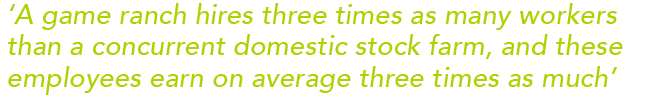 Oberem says that as far as employment opportunities are concerned, ‘research has shown that, on average, a game ranch hires three times as many workers than a concurrent domestic stock farm, and these employees earn on average three times as much, as the skill set needed is higher for the hospitality aspect of ranching. It is estimated that there are about 140 000 jobs created from game ranching in South Africa’.