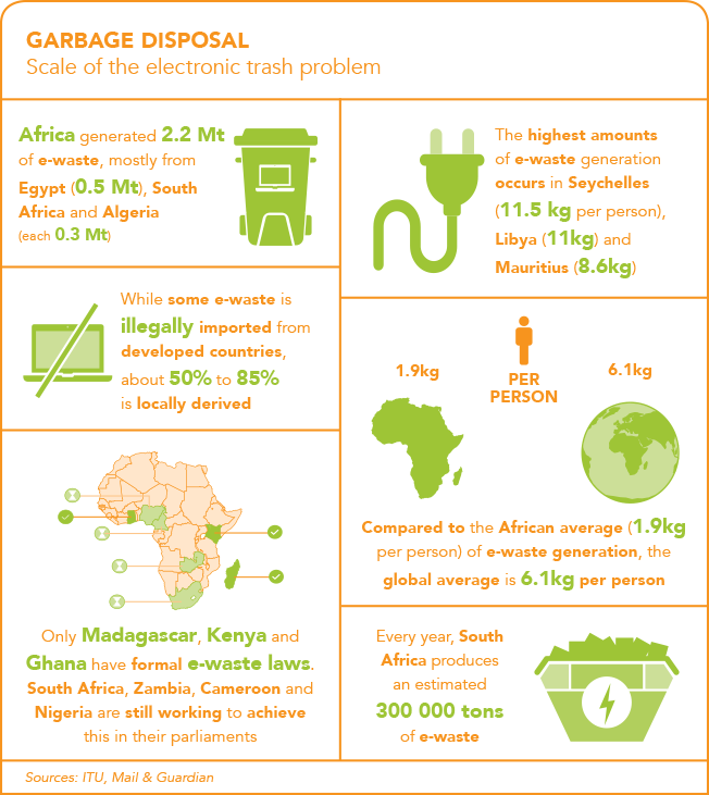 Pulling the plug Africa’s e-waste problem is getting more pronounced but there is a chance to create jobs through more efficient recycling initiatives Remember that clunky old phone you ditched last year when you got an upgrade? Or that fried PC monitor that had to be tossed? No harm done, you might think. But these unloved gadgets represent one of the major environmental hazards of our time. Electronic or e-waste, also called WEEE (waste electrical and electronic equipment), consists of all the discarded electrical devices that power our modern lifestyle – from fridges to mobile phones and batteries. With rapid tech advances, lower costs and shorter device lifespans as we continually replace them with newer models, the sheer mass of dead gadgets piling up in landfills is becoming overwhelming. It’s estimated that globally, the electronics industry currently generates up to 50 million tons of e-waste a year, with mobile phones being a major culprit. As consumer numbers increase and technology accelerates, these figures can only rise. In Africa, as elsewhere in the world, this is a huge problem. South Africa is the leading polluter on the continent, producing more than 300 000 tons of e-waste annually – and counting. In fact, this waste stream is growing faster than any other. Even if you stash your old gadgets in the back of a cupboard and not in the trash, it still represents a damaging waste of energy, resources and, not least, business opportunities. For one thing, electronic goods contain valuable minerals such as copper, gold, beryllium, tantalum and coltan. These could be productively recycled, saving energy and the non-renewable resources depleted in mining. More frighteningly still, e-waste also contains a complex array of chemical substances, many of them toxic – lead, mercury, cadmium and many others. According to the website of the e-Waste Association of South Africa (eWASA), ‘a typical computer monitor may contain more than 6% lead by weight’. In addition, it states that up to 36 separate chemical elements are incorporated into e-waste items. ‘It presents difficulties for recycling due to the complexity of each item.’ For example, many plastics used in electronic equipment contain flame retardants, which make them difficult to recycle. If these toxins find their way into landfill sites, they can contaminate groundwater, leach into the soil and, if burnt in an uncontrolled manner, pollute the air. The result? Major damage to the environment and a health risk for the wildlife and human beings that are exposed. Hardest hit, often, are the informal collectors, dismantlers and recyclers – the main actors in the processing of e-waste in Africa. Such people often work under extremely harsh and exploitative conditions that are very difficult to monitor. ‘Stories abound of the horrendous working conditions in different parts of Africa where imported waste goes to die,’ says Muna Lakhani, volunteer branch co-ordinator of South African environmental NPO Earthlife Africa and national co-ordinator of the Institute for Zero Waste in Africa. Often, these dangers are imported from more affluent parts of the world: despite international conventions aimed at reducing this problematic trade, illegal cross-boundary movement of waste within and into Africa persists, usually run by criminal gangs. West Africa is a major destination for e-waste, according to the UN Office on Drugs and Crime. Globally, the bulk of such waste – anything from 60% to 90% of the total – is illegally traded or dumped, according to UN Environment Programme (UNEP) research. Collectively, these rackets are worth nearly US$19 billion. ‘Under the guise of “recycling”, highly toxic waste is being dumped on poor communities,’ says Lakhani. What seems an intractable problem, however, is also an opening for entrepreneurs. Recycling e-goods can cut down on pollutants in the environment and be a source of income, ‘green jobs’ and valuable secondary raw material. According to eWASA chairman Keith Anderson, there is an enormous opportunity for e-waste recycling in South Africa and Africa. ‘eWASA, through its members, has about 1 000 collection points. However, we need at least four times more collection/dismantling facilities.’ A 2017 market intelligence report by GreenCape (a South African NPO promoting green economy solutions) points to the rapid growth of this sector. In 2009, there were just two large e-waste recyclers in South Africa (Universal Recycling Company and Desco), dismantling and processing 9 000 tons annually; by 2016, there were more than 20, processing 45 000 tons. The report continues: ‘The barriers to establishing an e-waste dismantling business are lower than that of dry recyclables, with a higher job factor (30 created for every 1 000 tons diverted) … This is a sector that can generate significant growth, as an 8% increase in e-waste diversion can result in a market potential of ZAR22 million and create 650 local jobs.’ The potential for employment creation and small business growth is therefore huge – and currently, African countries are not taking full advantage. South Africa, for example, only recycles 6% to 10% of its e-waste, with most of it exported or going to landfills, according to Anderson. At least 90% of printed circuit boards and 80% of plastic recovered from South African e-waste is exported for processing, according to a 2014 study conducted by Mintek, the Department of Science and Technology and the Council for Scientific and Industrial Research (CSIR) – thus losing economic benefits to the country. ‘If we can unlock this uncollected e-waste into the local value chain, we can create opportunities to grow South Africa’s e-waste recycling economy, as well as opportunities to increase investment in appropriate technologies and in innovative new technologies,’ says Linda Godfrey, manager of the CSIR’s waste roadmap implementation unit. Ind
